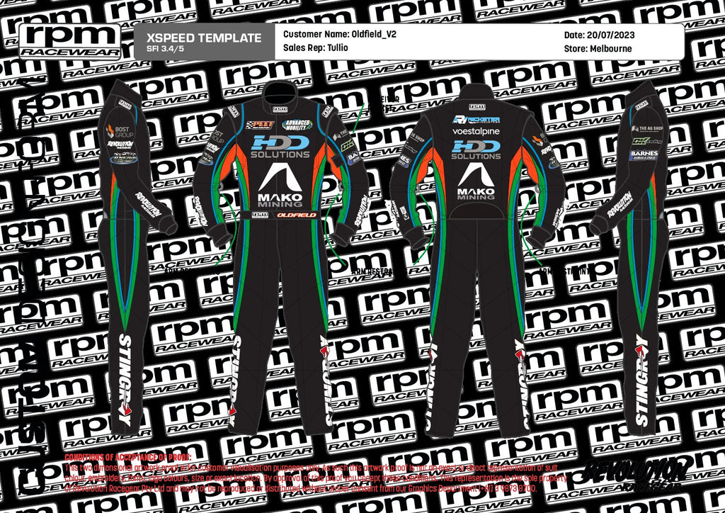 RPM Racewear has a range of fabric colours available to create a custom colour scheme to go with your sponsor logos and racecar graphics design. see a sample of the artwork created for a custom suit in the images below.